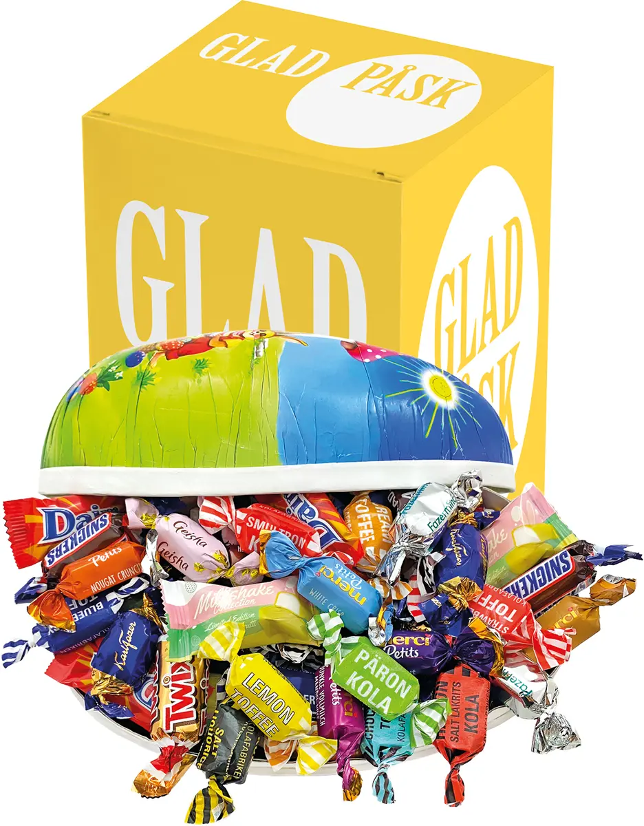Påskägg 23 cm med Happy Easter Lyx inslagen & twistad godisblandning inkl. gul påskbox Glad Påsk: