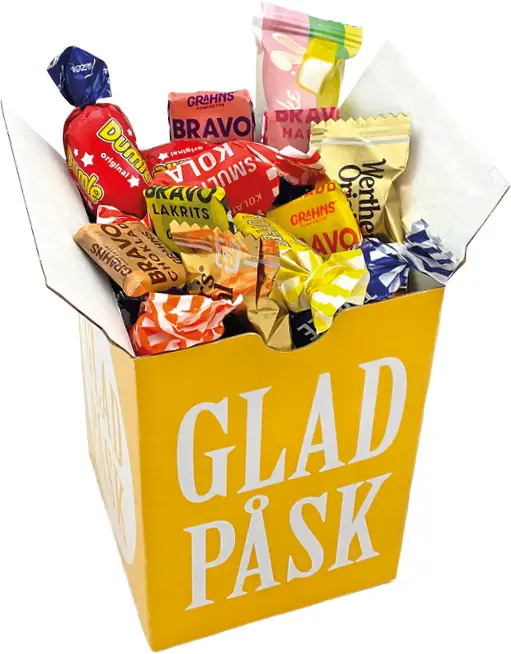 Pris per påskbox 12 cm med God Påsk inslagen & twistad godisblandning packat i gul påskbox Glad Påsk enligt nedan: