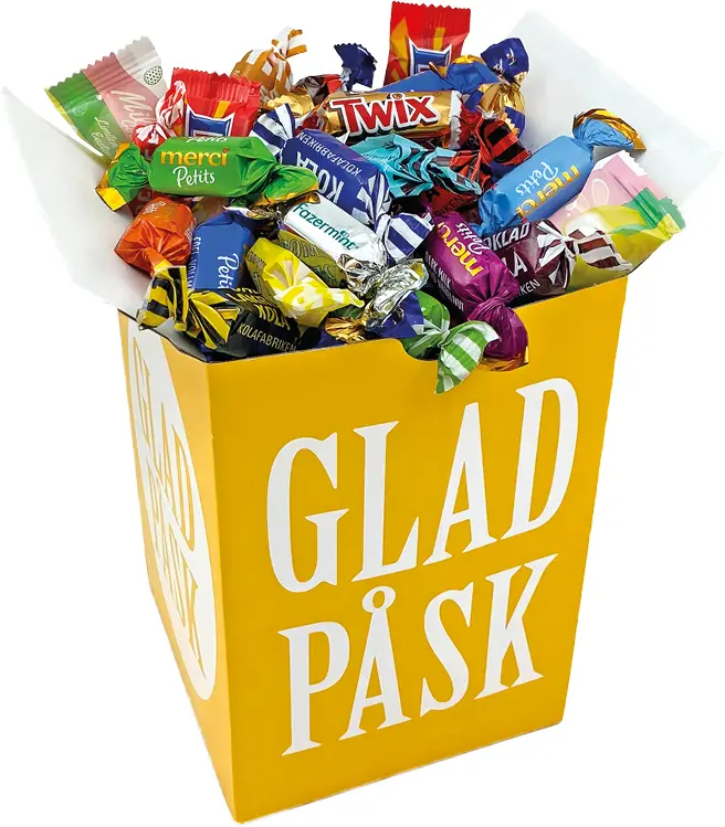 Pris per påskbox 18 cm med Happy Easter Lyx inslagen & twistad godisblandning packat i gul påskbox Glad Påsk enligt nedan: