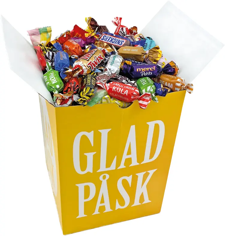 Pris per påskbox 23 cm med Happy Easter Lyx inslagen & twistad godisblandning packat i gul påskbox Glad Påsk enligt nedan: