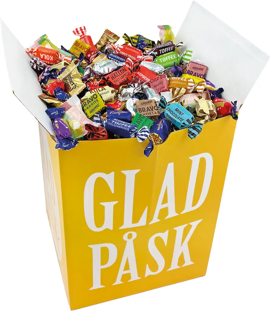 Påskbox 30 cm med Glad Påsk inslagen & twistad godisblandning packat i gul påskbox Glad Påsk: