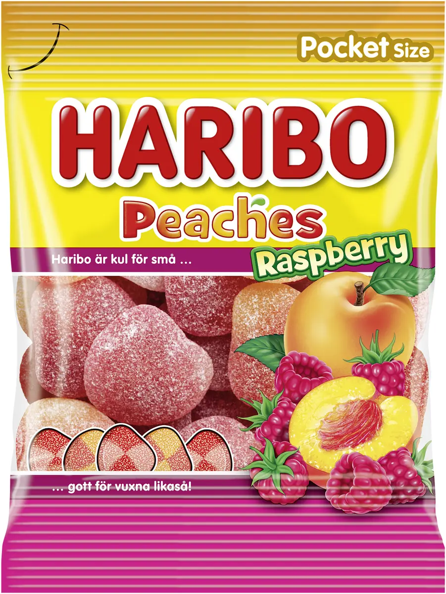 Socker; glukossirap; gelatin; fruktjuice från koncentrat (3 %): persiko, hallon; syra: citronsyra; frukt- och plantkoncentrat: safflor, äpple, citron, rättika, sötpotatis, morot, svarta vinbär, aronia, fläderbär, vindruva, hibiskus; arom; extrakt av fläderbär.