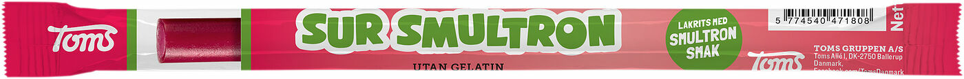En av Toms populära stänger, vardagligt kallad pingvinstång. Denna stång är rosa/röd med en något ljusare fyllning med en härlig smak av sura smultron. Sur Smultron är utan gelatin och innehåller endast naturliga färgämnen. Pingvinstängerna finns i många olika smaker så att alla kan hitta sin favorit.