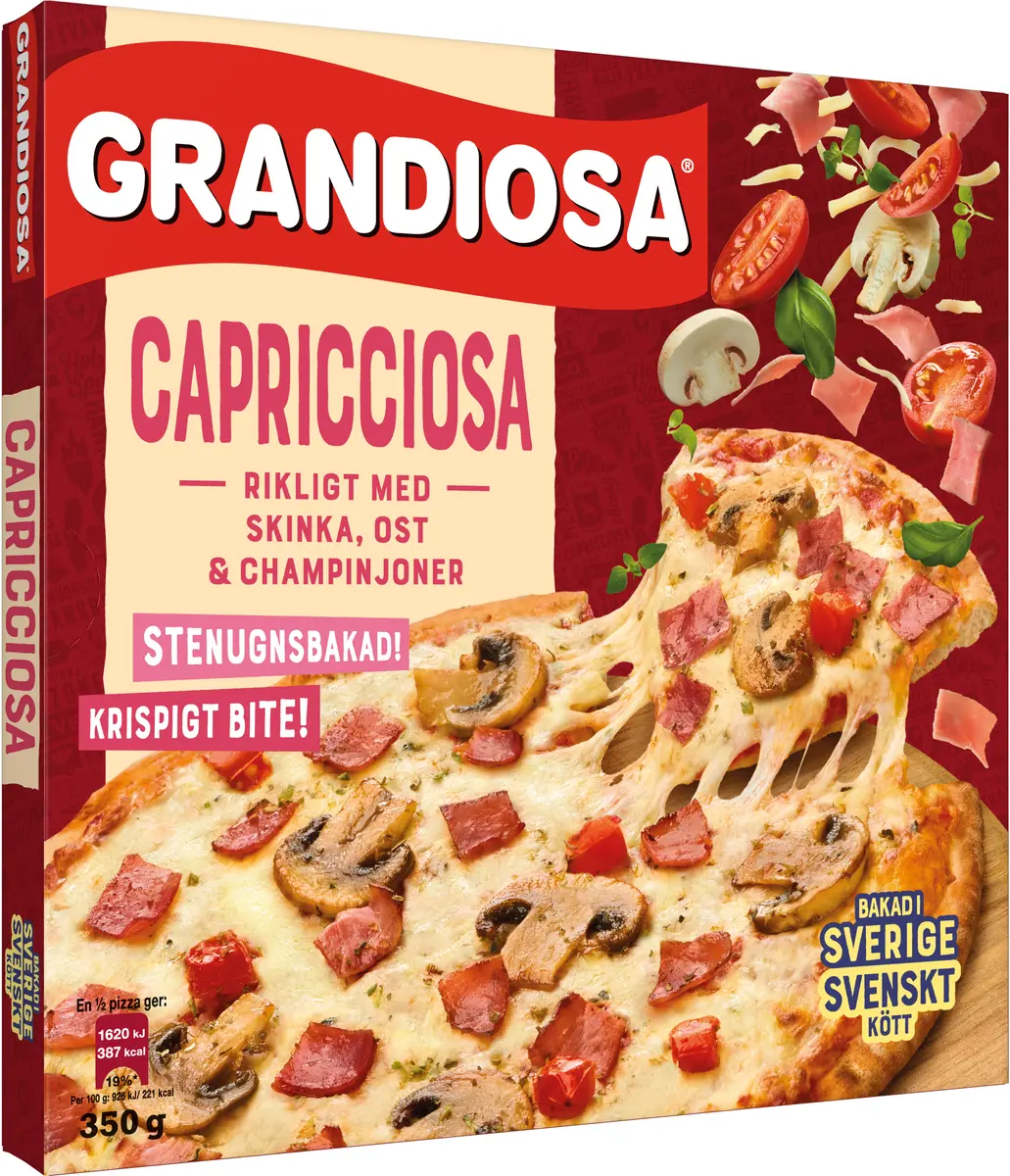 Vi har njutit av Capricciosan ända sedan Sveriges första pizzeria öppnade 1969. Denna klassiska pizza är fortfarande en naturlig del av svensk pizzatradition och det är inte svårt att gissa varför. Toppad med X-TRA ost, svensk skinka och champinjoner är det en klassisk smakupplevelse som inte har slagit fel på femtio år. Precis som alla Grandiosas pizzor är Capricciosan stenugnsbakad i Sveriges största pizzeria i Vansbro. Varför bryta ett vinnande koncept?