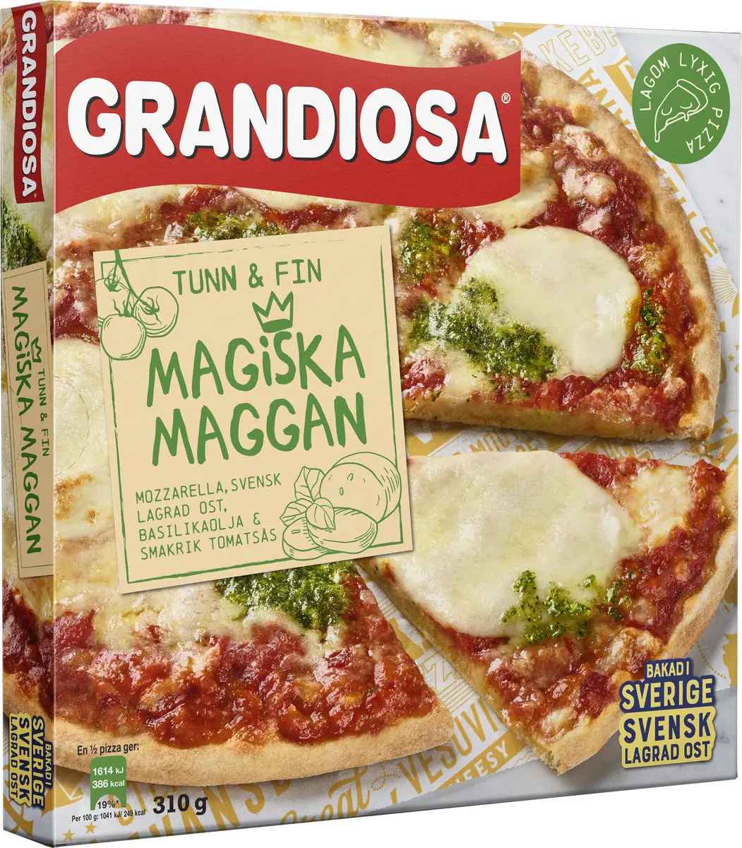 Äntligen en fräsch och tunnbottnad pizza med unika svenska smaker. Vi på Grandiosa kallar den 'Tunn och Fin'! Magiska Maggan är en version av den klassiska Margeritapizzan med tunn och krispig botten toppad med smakrik tomatsås, krämig mozarella, svensk lagrad hårdost och basilikaolja. Stenugnsbakad med kärlek i Sverige. Läs mer på grandiosa.se