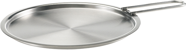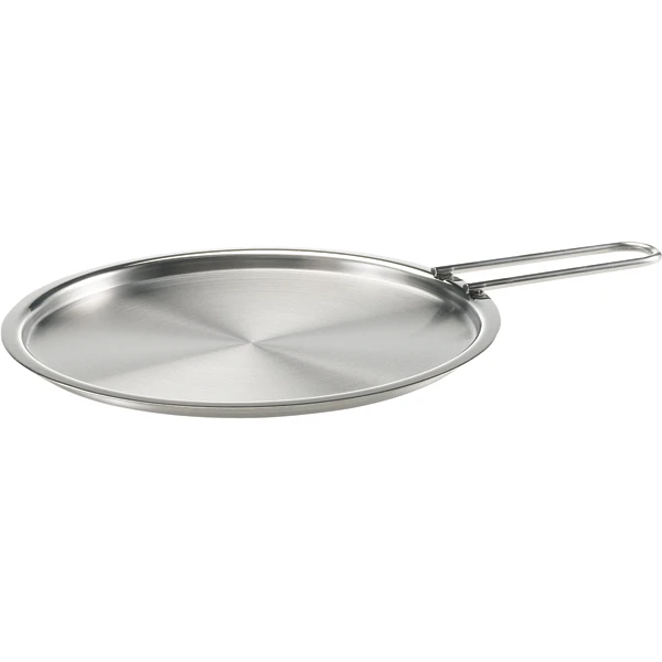 De platta locken i rostfritt stål kan staplas inuti varandra eller hängas upp på krokar. Locket har "långa" handtag placerade på sidan så att man kan titta till maten utan att bränna sig. Under matlagningen kan du hålla andra rätter varma på locket.
