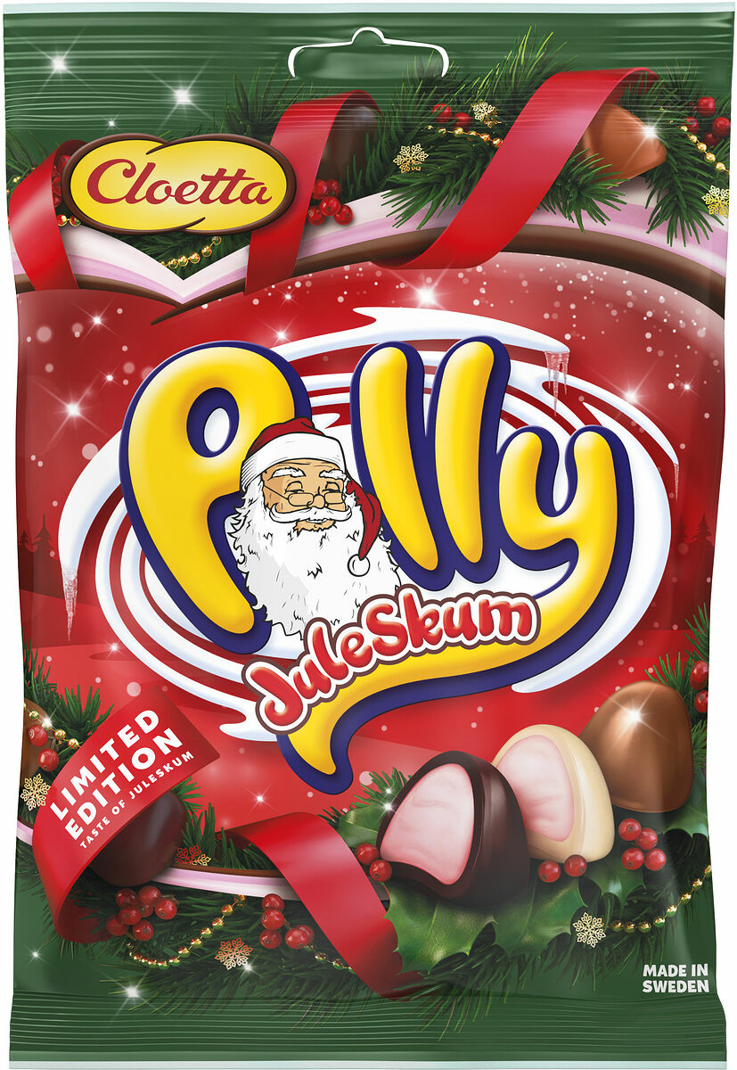 "Älskade klassiska Juleskum och Polly går ihop och blir nya POLLY JULESKUM - Två godissorter som tillsammans blir en perfekt kombination! Polly är härligt sega skumtoppar dragerade med en ljuvlig chokladsmak. Juleskum är skumtomtar med smak av jordgubbe och är idag ett av de mest uppskattade julgodiset i Sverige. Nya Polly Juleskum har Pollys välkända sega insida, men nu med smak av Juleskum! Skumtopparna är dragerade i tre olika smaker av choklad - Mörk, ljus och vit. Så goda att det är omöjligt att bara ta en…"