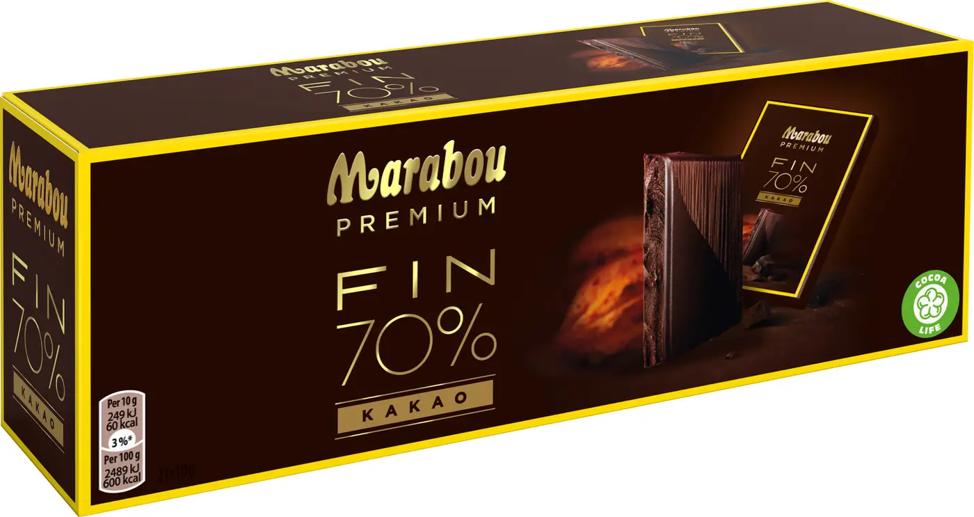 En spröd och tunn mörk premiumchoklad med 70% kakaohalt i lyxig bjudask för den riktiga finsmakaren.