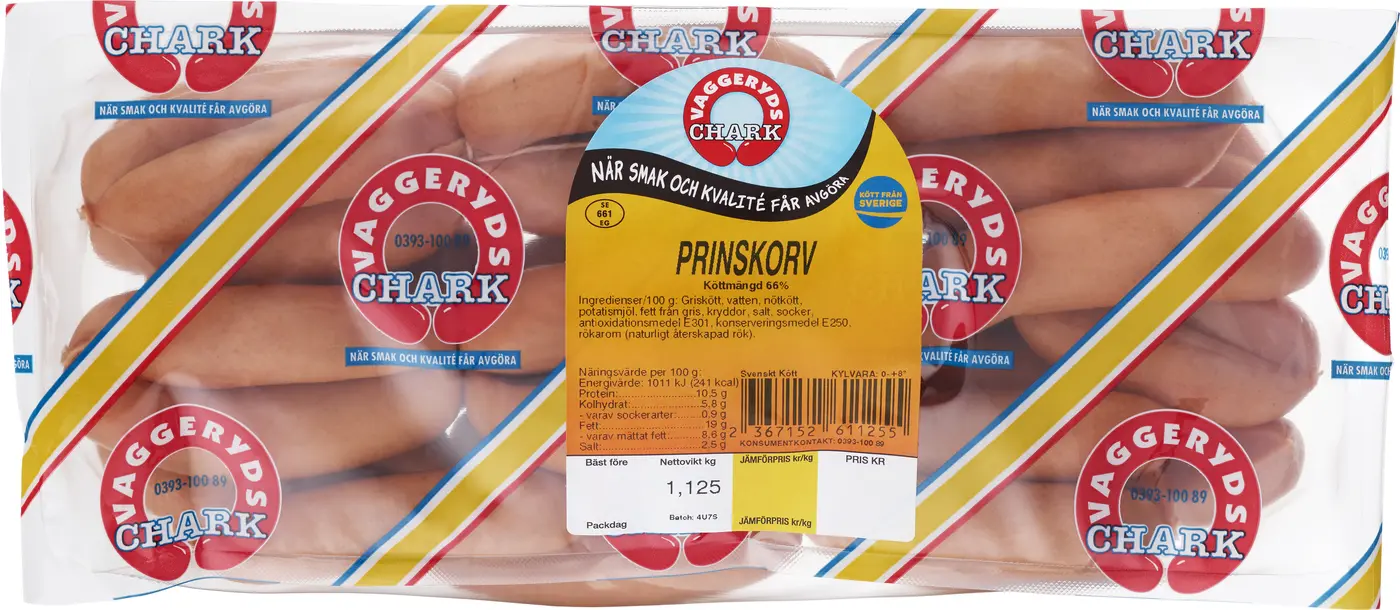Griskött, Vatten, Nötkött, Potatismjöl, Grisfett, Kryddor, Koksalt, Socker, Askorbat, (Antioxidationsmedel E301), Nitrit (Konserveringsmedel E250), Rökarom.
