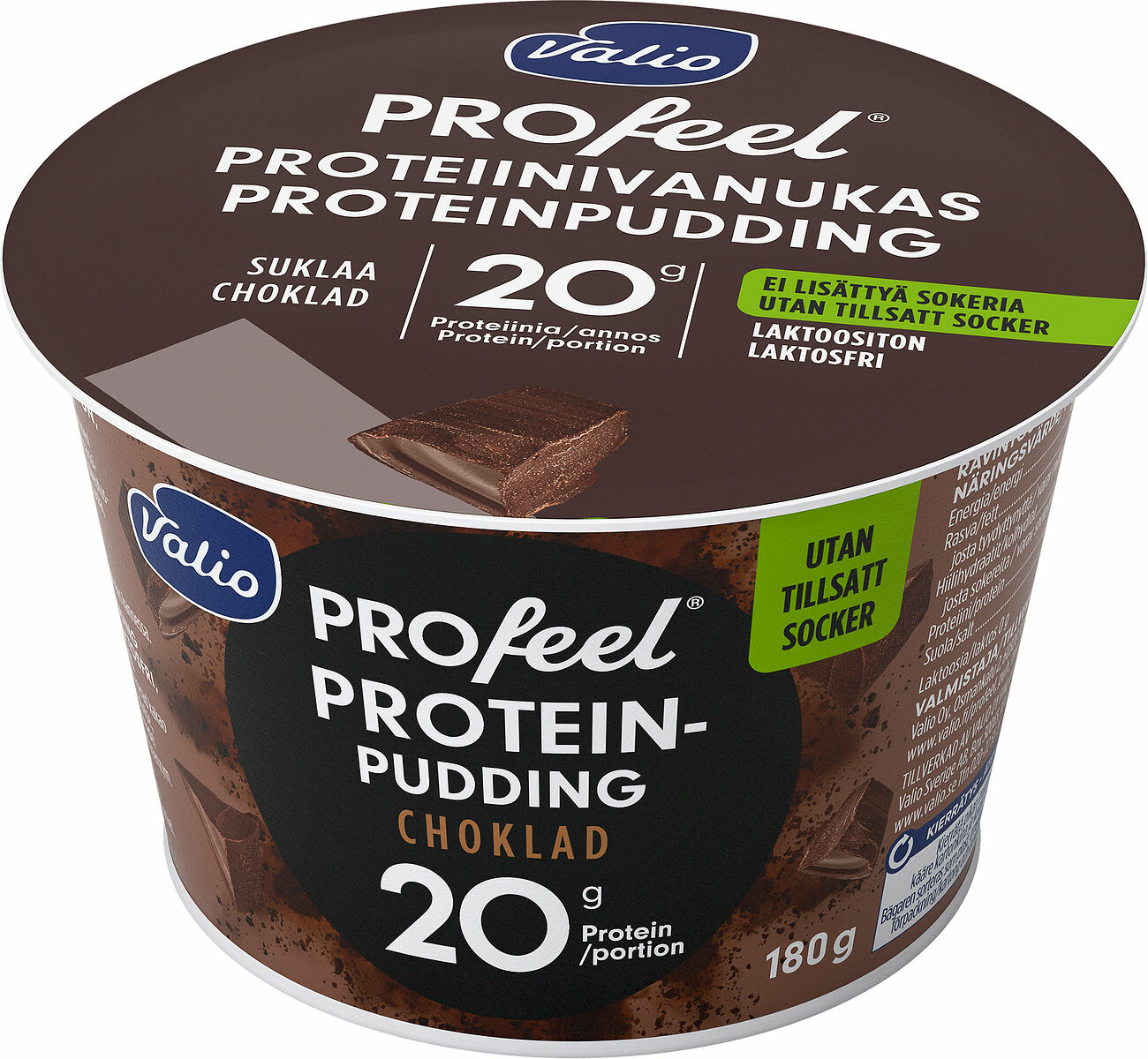 Valio PROfeel® proteinpudding är ett gott och krämigt mellanmål med smak av fyllig choklad. Produkten innehåller hela 20g protein/förpackning och den är både laktosfri och helt utan tillsatt socker.