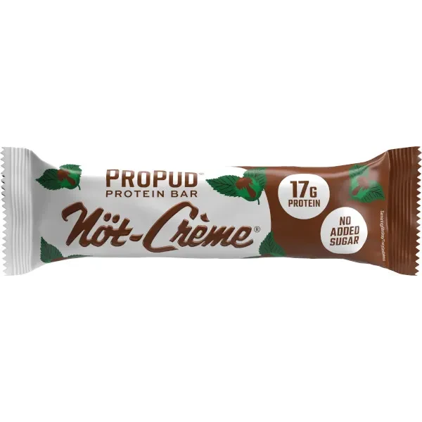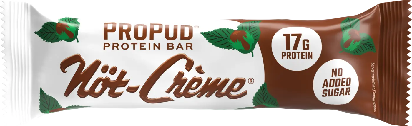 ProPud Protein Nöt-Crème® - en mjuk proteinbar med hasselnötter och överdragen med choklad. Utan tillsatt socker och 17 gram protein per bar. Utan palmolja.