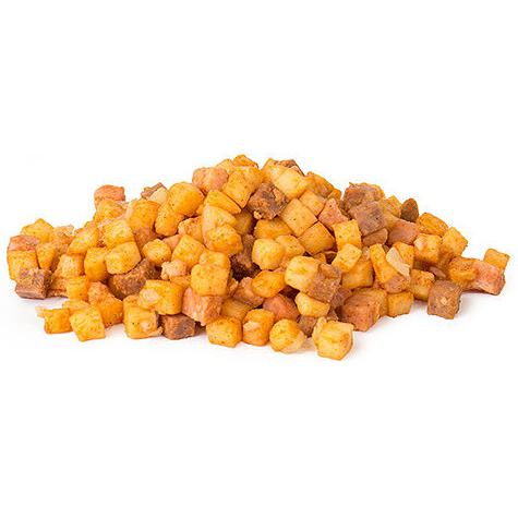Pytt i panna med friterad tärnad potatis, blancherad lök, korv och kött av fläsk och nöt