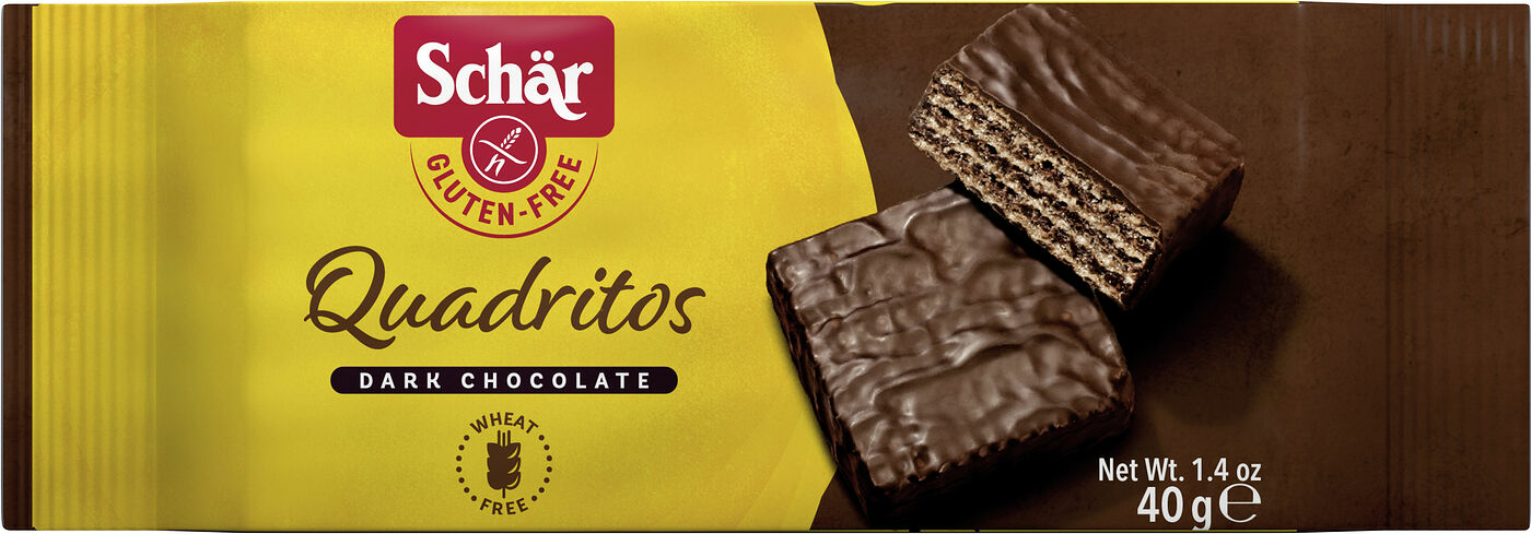 Schär Quadritos är fyrkantiga, krispiga och spröda kexchokladkakor med 42% chokladöverdrag och chokladkräm. Perfekt till utflykten eller fikapausen. Innehåller fibrer. Fri från gluten och vete. Utan tillsats av ägg och konserveringsmedel.