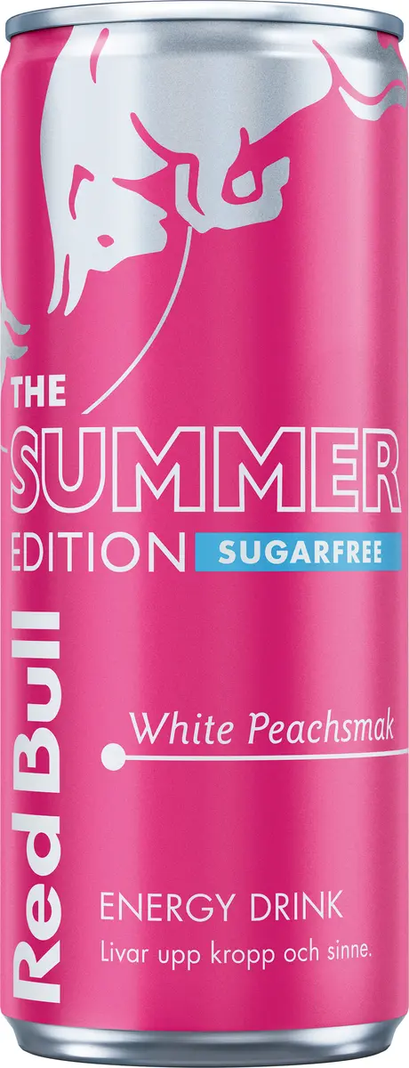Red Bull Summer Edition Sockerfri med smak av white peach innehåller ingredienser av högsta kvalitet: koffein, taurin, B-vitaminer, sukralos & acesulfam K, vatten. Red Bulls burkar är gjorda av 100% återvinningsbar aluminium. Livar upp kropp och sinne.