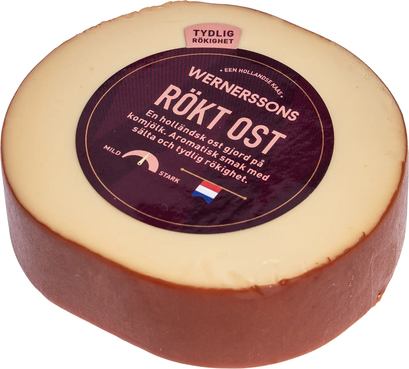 INGREDIENSER: Ost (pastöriserad KOMJÖLK, salt, mjölksyrakultur, löpe, färgämnen E160b(ii) och E160a), vatten, SMÖR, majsstärkelse, emulgeringsmedel E452 och E339, salt, rökarom