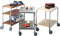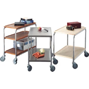Skivor av rostfritt eller laminat. De rostfria skivorna har dämpmatta på undersidan och vulstkant. Laminatskivorna har trälist runt om som är nedfräst i hörnen. Fyra svängbara hjul Ø 125 mm. Max belastning 100 kg.