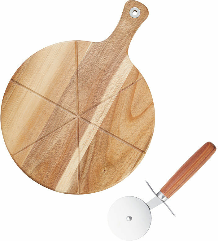 Sade pizzaset är till för alla som älskar att baka egen pizza hemma. Serveringsskivan i akaciaträ har fördjupningar som gör det enkelt att skära upp pizzan i perfekta trekanter med den tillhörande skäraren.