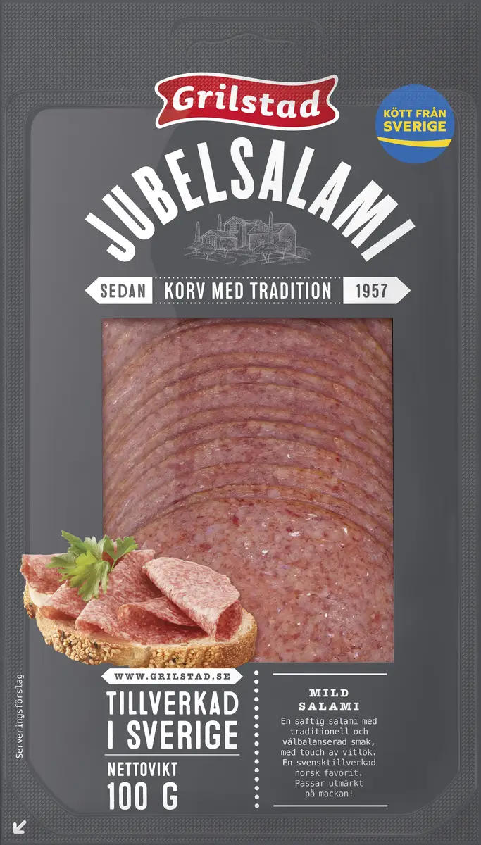 Grilstad Jubelsalami är en salami med traditionell och välbalanserad smak, med touch av vitlök. Passar utmärkt på smörgåsen/mackan!