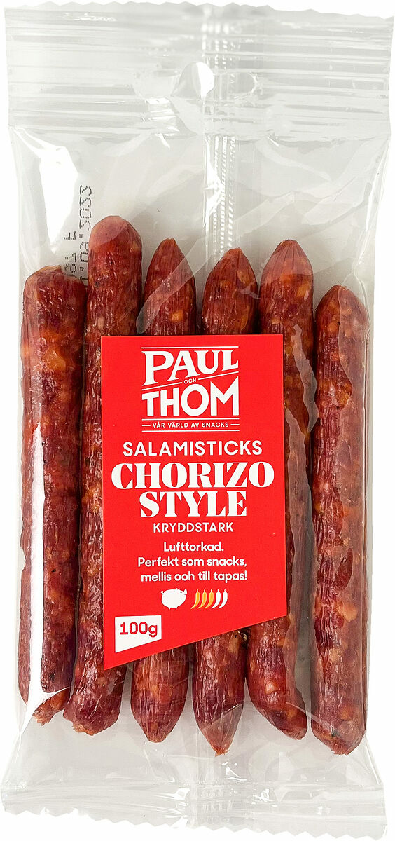 Griskött*, salt, kryddor (chili, paprika, peppar, anis, ingefära, vitlök), dextros, antioxidationsmedel: E301. Örter, paprikaextrakt, konserveringsmedel: E250; arom, startkultur. Till 100g salamisticks har 155g griskött använts. *Ursprung: EU.