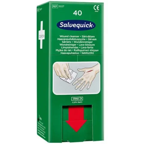 Sterila påsar gjorda av non-woven vävnader, som är mättade i en sårrengöringsvätska. Servetter är förpackade i en väl förseglad folie, vilket förhindrar läckage och garanterar sterilitet. Salvequick Wound Cleanser Sachet är avsedd för mekanisk rengöring av mindre sår när rent kranvatten inte är tillgängligt.