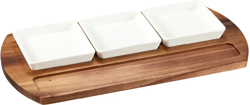 Servera dina favoriträtter och aptitretare på ett elegant sätt med vår serveringsbricka Selina. Vår serveringsbricka kommer komplett med tre skålar tillverkade av slitstarkt porslin och bricka / skärbräda i Akaciaträ. Skålarna är perfekta för att servera sallader, såser, snacks eller andra smårätter. Med sin kombination av naturlig skönhet och funktionalitet kommer den säkert att imponera på dina gäster och höja din serveringsnivå till nya höjder.