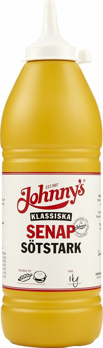 Johnny’s Sötstarka Senap är Sveriges mest älskade senap. Smaken har en fin balans mellan syra och sötma med en liten ton av honung i eftersmaken. 1987 började Johnny göra sin karaktärsfulla senap som tillverkas lokalt i vår senapsfabrik i Eslöv. Passar till korv, hamburgare och feta fiskar som lax och röding. Den är också läcker till grönsaker, sallader och primörer som t ex sparris.