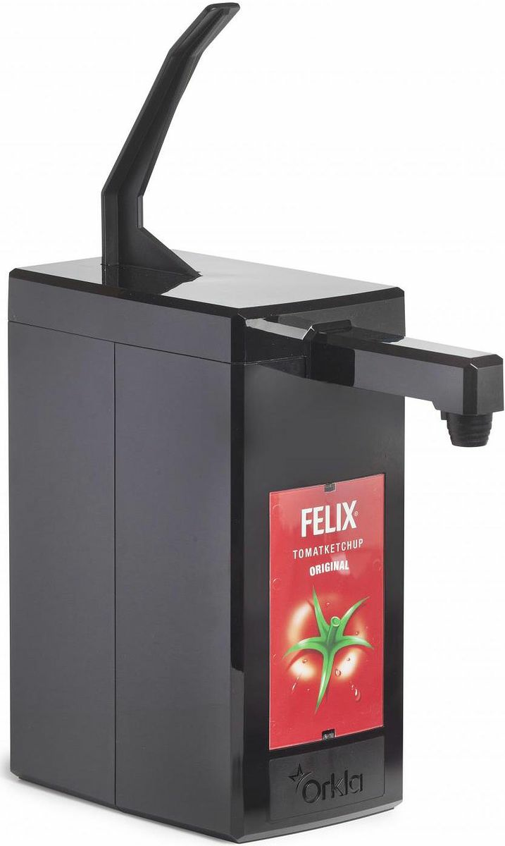 Svart dispenserhus med 11,5 mm pump för FELIX ketchup, senap och dressingpåsar 2,5 kg.