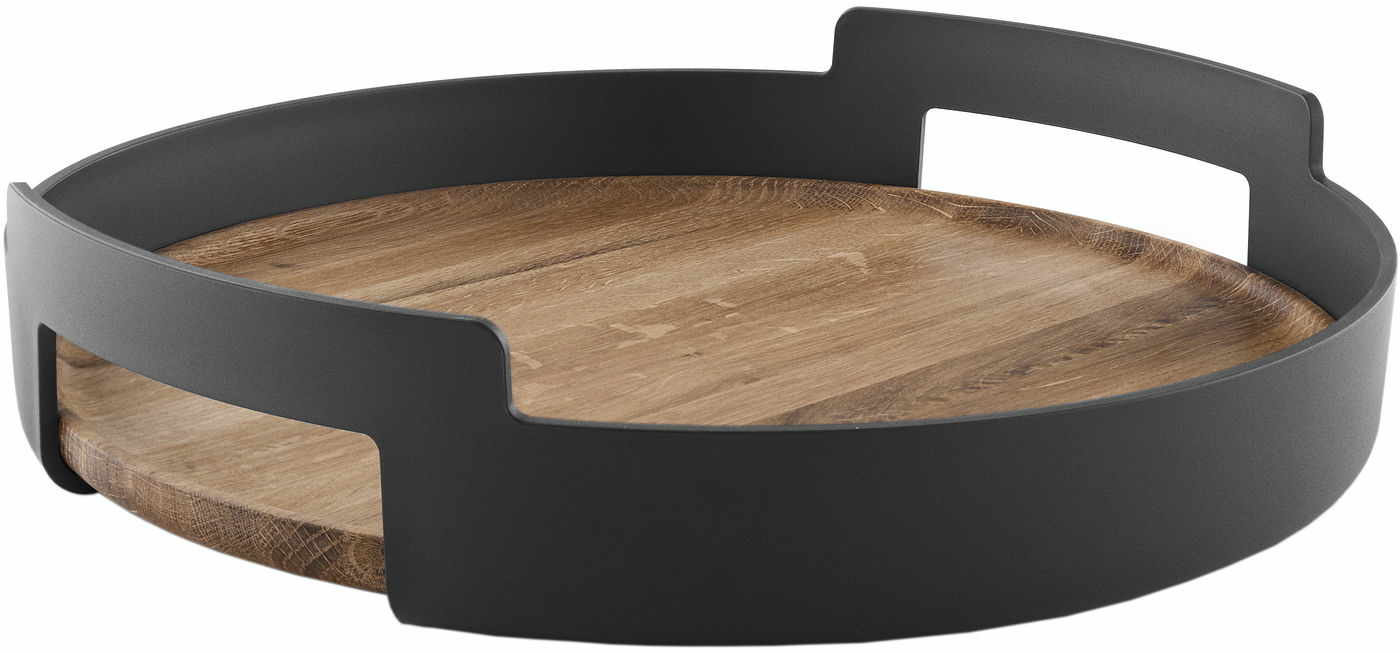 Serveringsbrickan är både stilren och praktisk i sin design, med höga kanter och bärhandtag som gör brickan enkel att greppa. Kombinationen av ekträ och mattsvart plast ger serveringsbrickan ett exklusivt och tidlöst uttryck med en elegant finish.