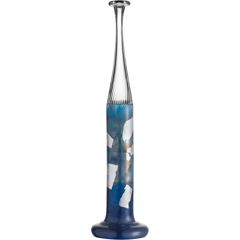 De skimrande färgerna har åstadkommits genom en tillsats av silver som i den glödande hettan ger den speciella effekten. Den klara övre delen dras ut på frihand så långt det varma glaset tillåter. Delvis blåsta i en ångande träform.