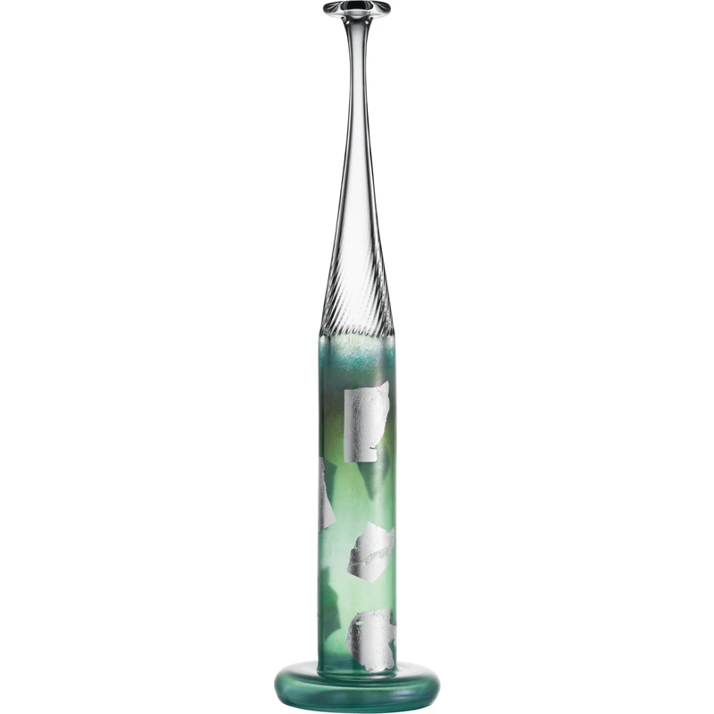 De skimrande färgerna har åstadkommits genom en tillsats av silver som i den glödande hettan ger den speciella effekten. Den klara övre delen dras ut på frihand så långt det varma glaset tillåter. Delvis blåsta i en ångande träform.