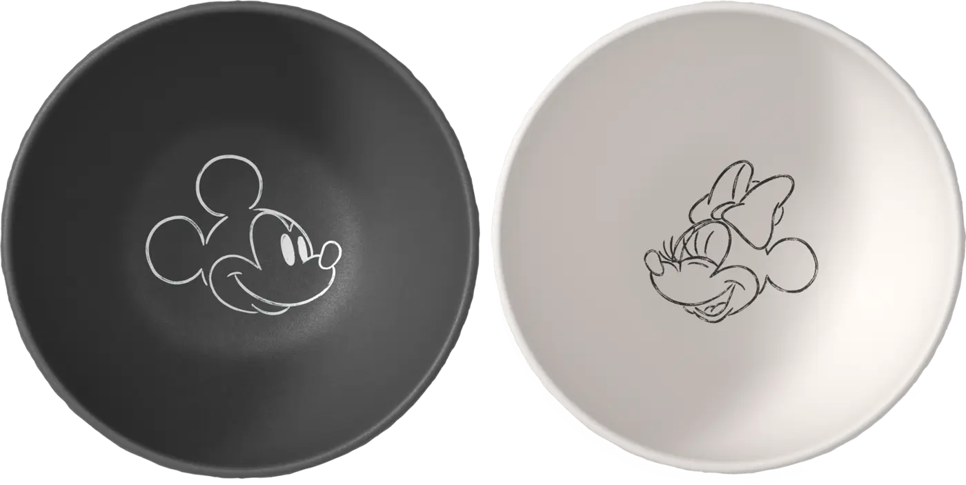 Den skifferinspirerade, matta ytan kombineras med lekfulla Mickey & Minnie Mouse-skisser som ger skålarna ett unikt och charmigt uttryck.