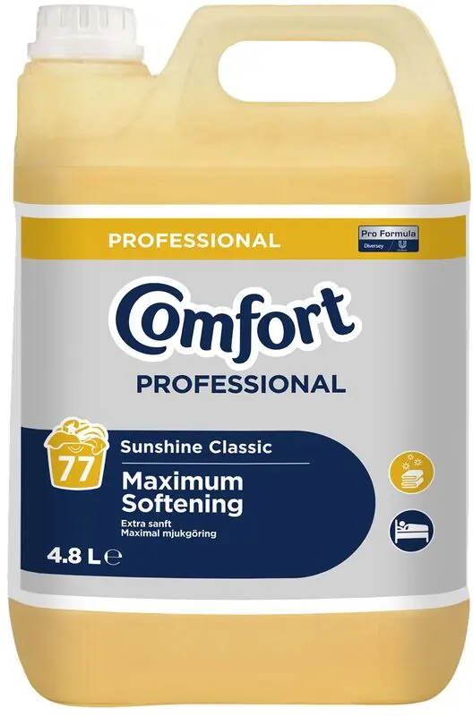 Comfort Sunshine Classic Professional ger inte bara exceptionell mjukhet och fantastisk doft: genom att använda det i varje tvätt känns kläderna mjuka och skonsamma mot huden, hjälper kläderna att andas och skyddar klädernas färger. Det bidrar också till att kläderna ser nyare ut längre, och efter tvätten förkortar det torktiden och underlättar strykningen.