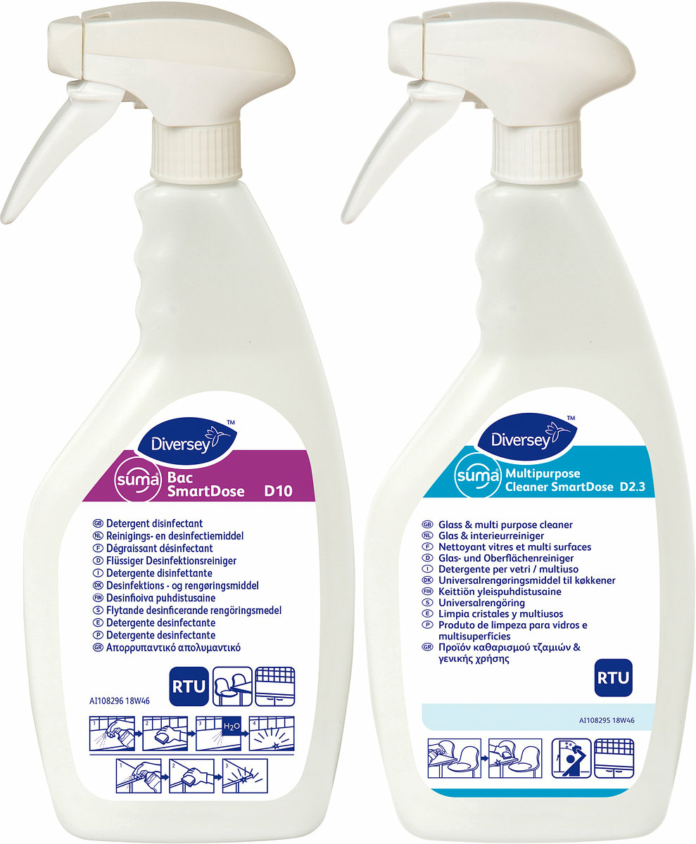 Refilllsprayflaskor för SmartDose systemet. 4 etiketter vardera till Suma Multipurpose Cleaner D2.3 SmartDose samt Suma Bac D10 medföljer.
