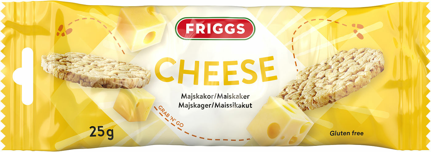 I Friggs Snackpack Cheese hittar du 10 goda majskakor i smaken ost. Perfekt när du är på språng, är sugen på något gott eller behöver ett litet mellanmål.