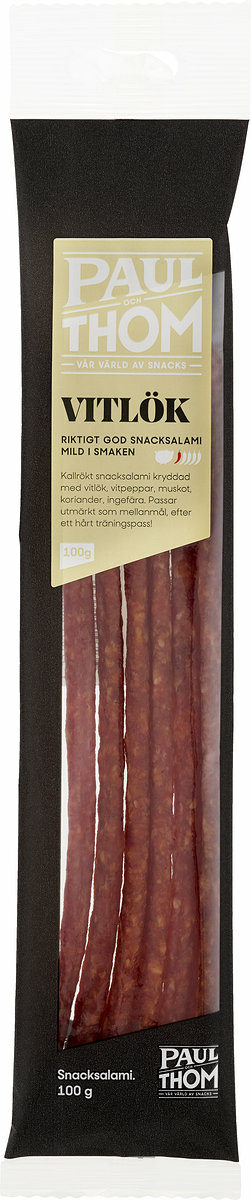 Kallrökt snacksalami kryddad med vitpeppar, vitlök, chili, paprika, muskot, koriander. Passar utmärkt tillbufféen, tapas eller som mellanmål efter ett hårt träningspass.