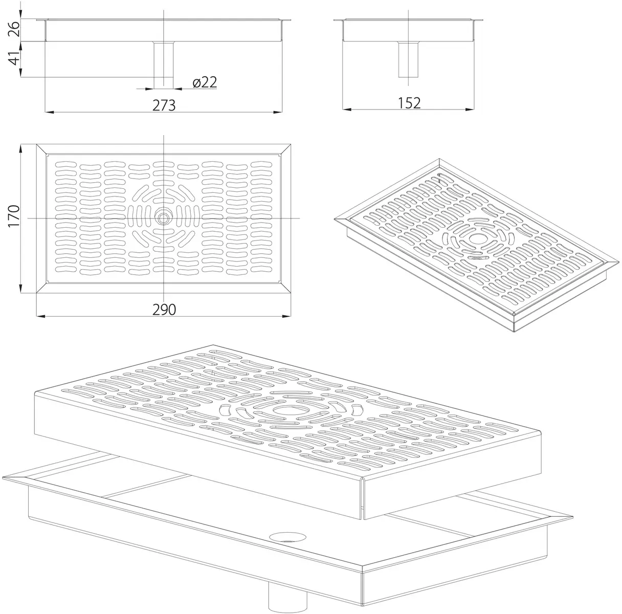 Komplett nedsänkt spillbricka i rostfritt stål med avloppsslang och två klämmor.