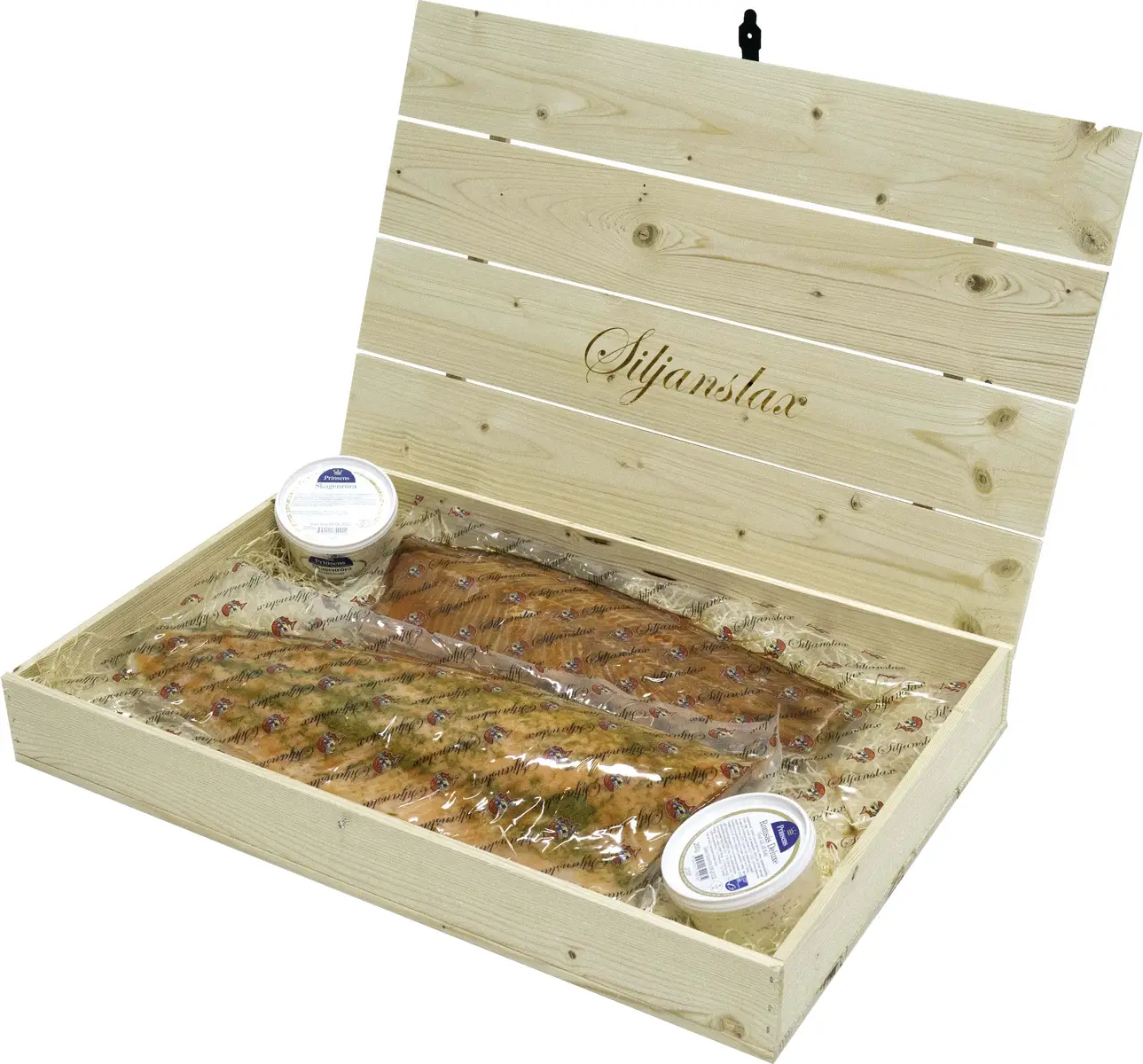 Siljanslax erbjuder prima svensk urbenad och heltrimmad regnbågslax i en lyxig trälåda. Stora Laxlådan innehåller en varmrökt regnbågslax och en ugnsmarinerad regnbågslax med dillsmak på ca totalt 1,6 kg tillsammans. Samt en Romsås 250 ml och Limeaioli 250 ml. En oslagbar kombination som passar som present till företag, bekanta och vänner. Enkelt, gott och nyttigt.