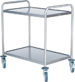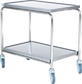 Ställning och skivor av rostfritt. Skivorna har dämpmatta på undersidan och vulstkant. Fyra svängbara hjul Ø 125 mm varav