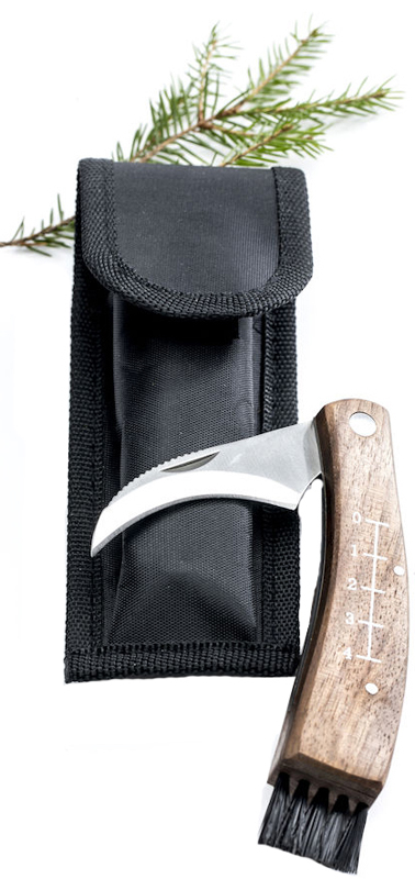 En praktisk svampkniv som har borste i ena änden och linjal på träskaftet, kniven levereras i ett fodral.