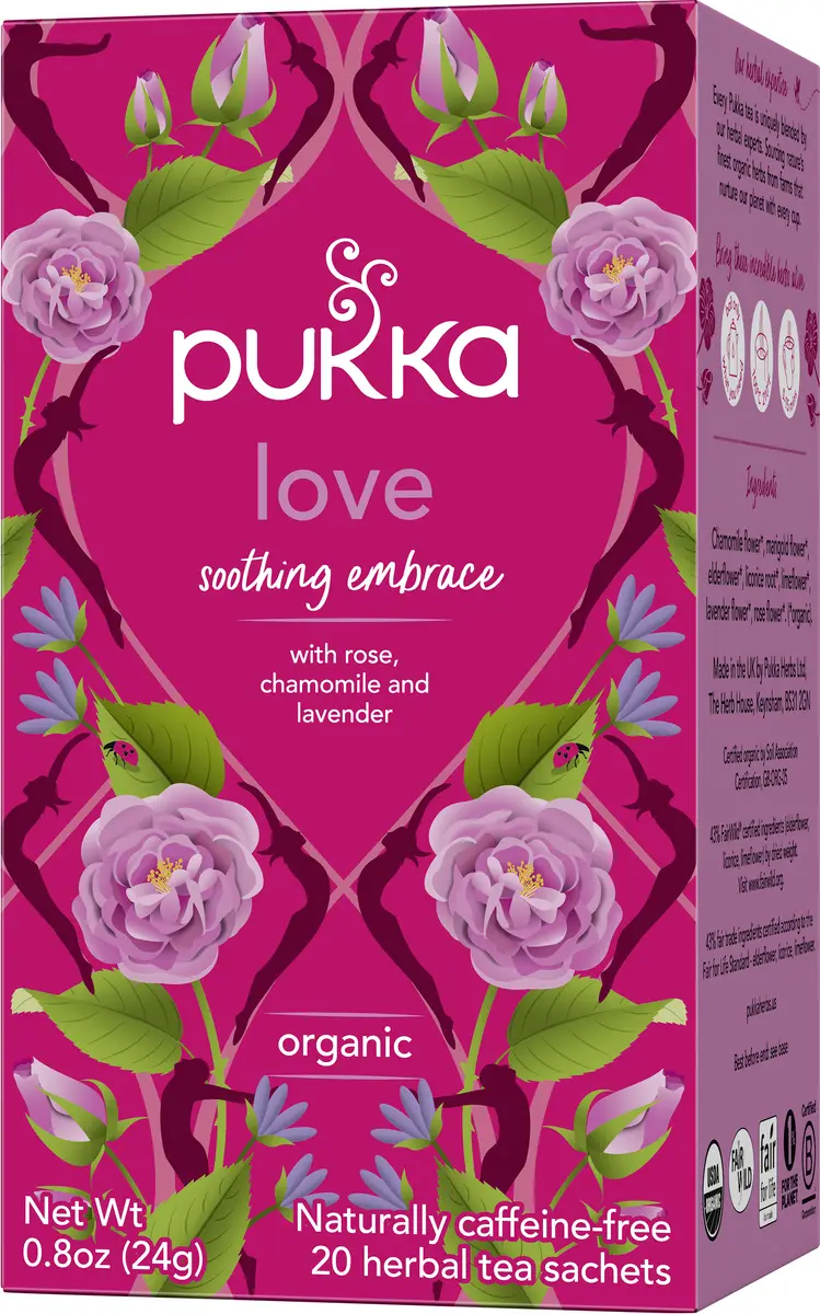 En unik blandning doftande blommor och välkända örter som gör både morgnar och kvällar lite skönare. Ett te som gjorts både med och för kärlek och därför fått namnet Love. Naturligt koffeinfri. Ekologisk, Fair for life samt Fairwild.
