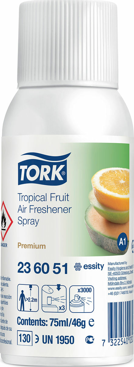 Reglera lukt i ditt toalettutrymme effektivt med Tork Airfreshener Spray Frukt Sprayerna innehåller koncentrerade doftoljor och luktneutraliserande innehåll för att avlägsna dålig lukt och samtidigt avge en varaktig fräsch doft. Sprayerna passar i Tork Dispenser Airfreshener Spray