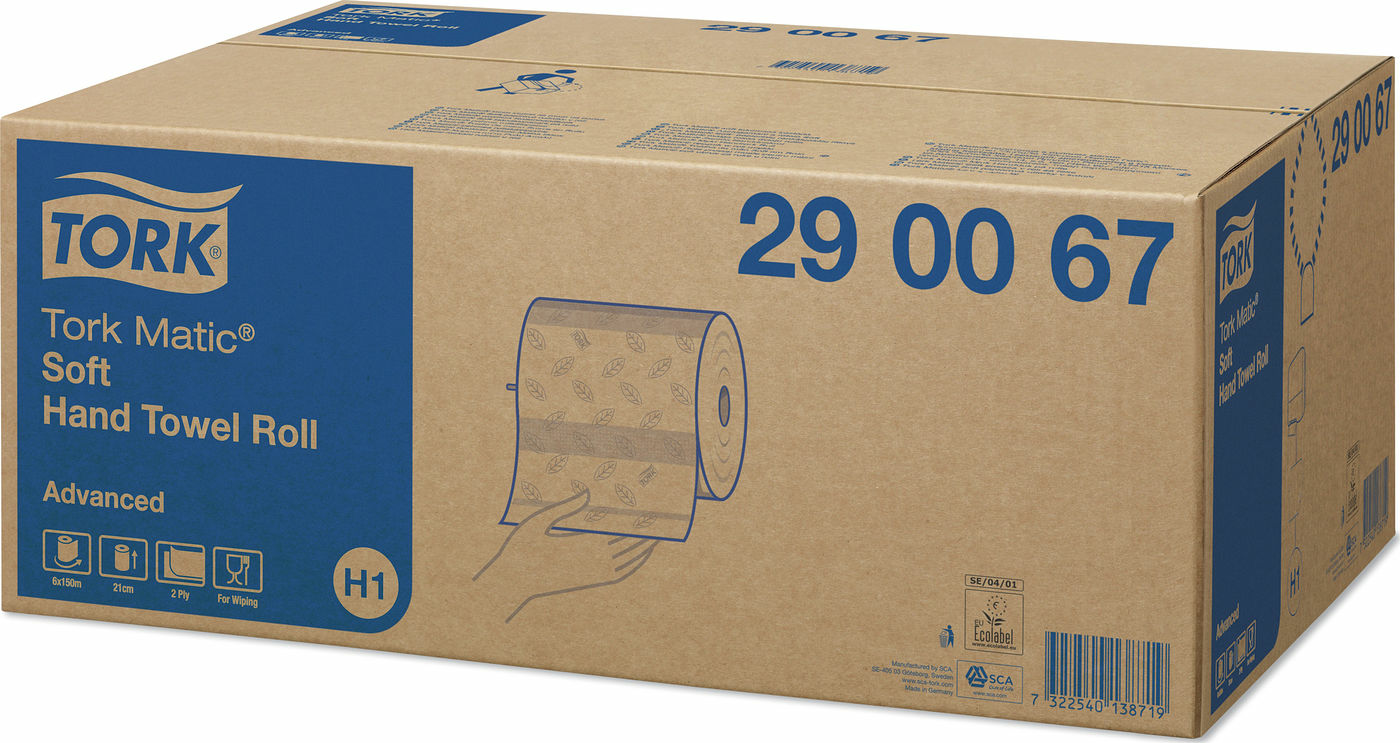 Gör det bekvämt för dina besökare med Tork Matic® Mjuk Handduk på rulle. Pappret torkar händerna ordentligt och är präglat med ett snyggt grått lövmönster. Rullarna passar i Tork Matic® Dispenser Handduk på rulle som har utvecklats för enkelt underhåll i välbesökta toalettutrymmen. Dispensern sparar tid och reglerar åtgången genom att mata ut ett ark i taget.
