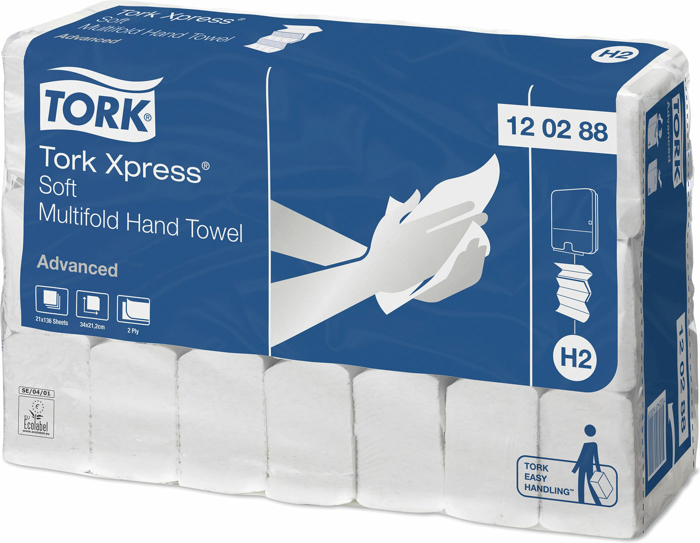 Med behagliga Tork Xpress® Mjuk Multifold Handduk i Advanced design får dina besökare en bekväm och utmärkt handavtorkning. Handdukarna är skonsamma mot huden och förmedlar en känsla av hög kvalitet. De passar i Tork Xpress® Dispenser Multifold Handduk för toalettutrymmen med medelhög besöksfrekvens. Dispensern får plats i små utrymmen och erbjuder dina gäster både komfort och hygien.