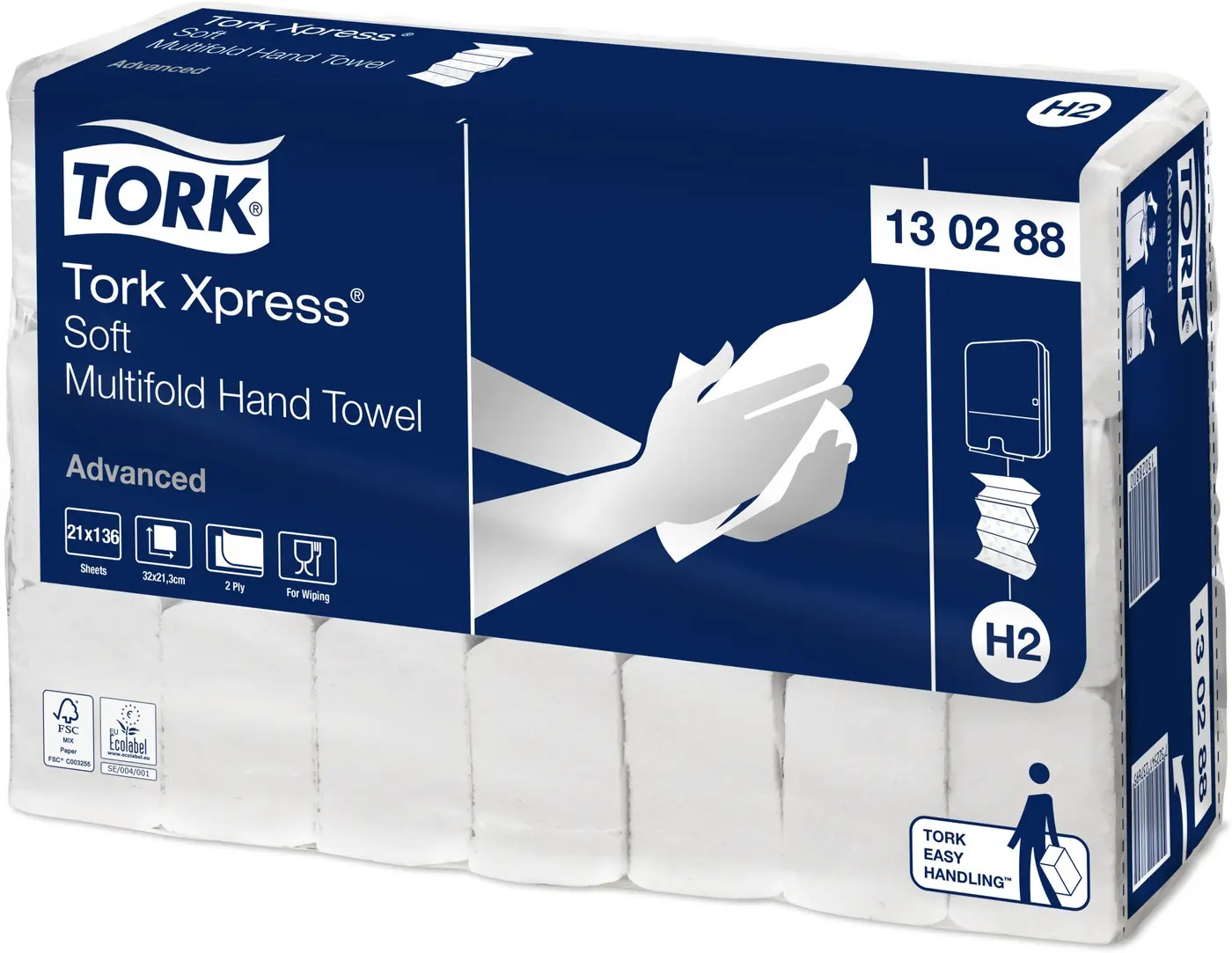 Med behagliga Tork Xpress® Mjuk Multifold Handduk i Advanced design får dina besökare en bekväm och utmärkt handavtorkning. Handdukarna är skonsamma mot huden och förmedlar en känsla av hög kvalitet. De passar i Tork Xpress® Dispenser Multifold Handduk för toalettutrymmen med medelhög besöksfrekvens. Dispensern får plats i små utrymmen och erbjuder dina gäster både komfort och hygien.