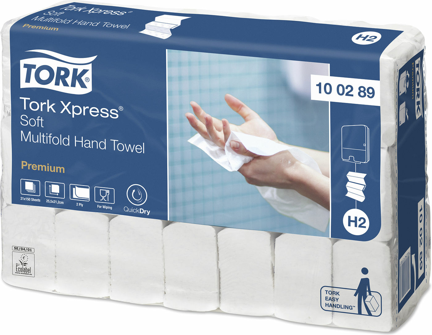 Erbjud utmärkt handavtorkning och gör det bekvämt för dina besökare med stora och mjuka Tork Xpress® Mjuk Multifold Handduk som är skonsam mot huden och har en känsla av hög kvalitet. Dessa handdukar passar i Tork Xpress® Dispenser Multifold Handduk för toalettutrymmen med medelhög besöksfrekvens. Den får plats i små utrymmen och erbjuder dina gäster både komfort och hygien.