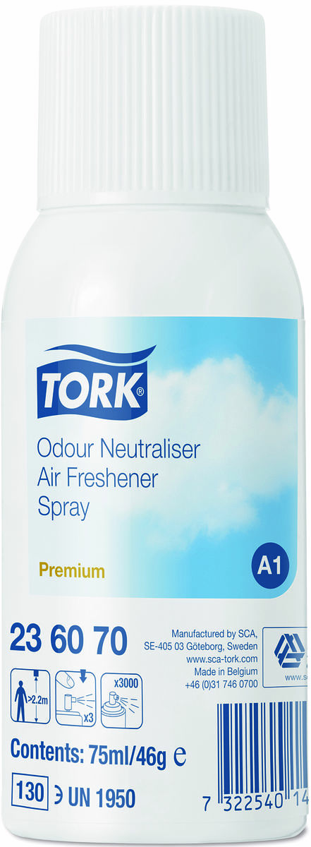 Reglera lukt i ditt toalettutrymme effektivt med Tork Airfreshener Spray Neutral Sprayerna innehåller koncentrerade doftoljor och luktneutraliserande innehåll för att avlägsna dålig lukt och samtidigt avge en varaktig fräsch doft. Sprayerna passar i Tork Dispenser Airfreshener Spray.