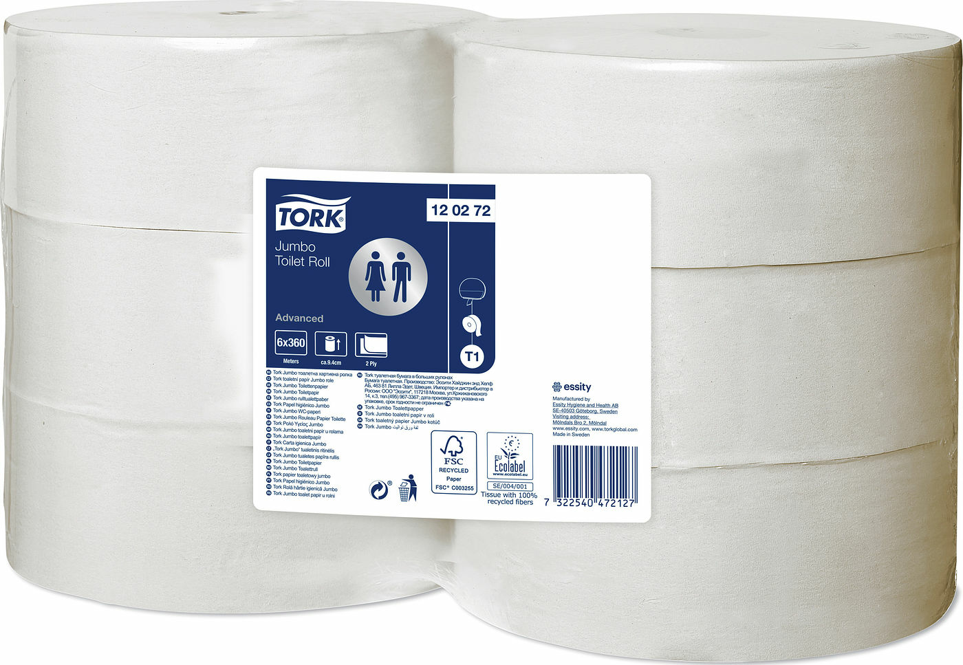 Tork Jumbo Toalettpapperssystem innebär effektivt utnyttjande av tiden och minskade kostnader och erbjuder mycket mer toalettpapper än standardrullar. Tork Jumbo Toalettpapper 2-lagers skapar en god balans mellan kostnad och prestanda och passar perfekt för platser med hög besöksvolym.