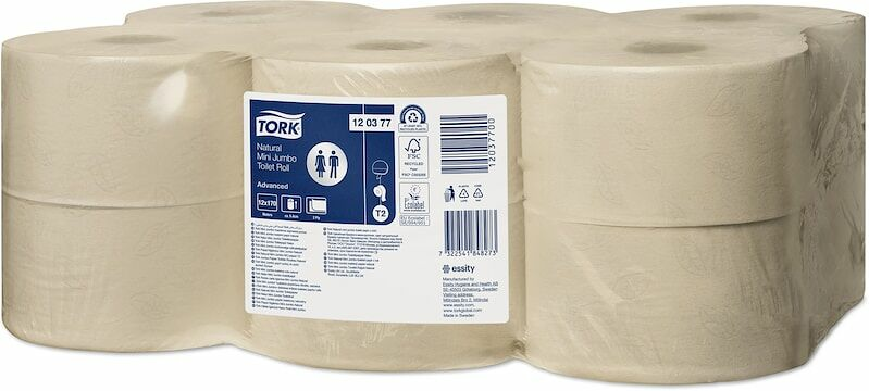 Systemet Tork Mini Jumbo innebär effektivt utnyttjande av tiden och minskade kostnader och erbjuder mycket mer toalettpapper än standardrullar. Tork Mini Jumbo toalettpapper med 2 lager i Advanced-kvalitet skapar en god balans mellan kostnad och prestanda och passar perfekt för platser med medelhög till hög besöksfrekvens. Pappret tillverkas av 100 % återvunna fibrer.