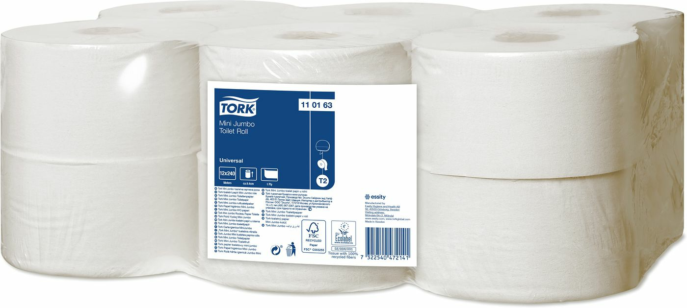 Tork Mini Jumbo Toalettpapperssystem innebär effektivt utnyttjande av tiden och minskade kostnader och erbjuder mycket mer toalettpapper än standardrullar. Tork Mini Jumbo Toalettpapper 1-lagers ger en god balans mellan kostnad och prestanda och är lämpligt för platser med medelhög till hög besöksvolym.