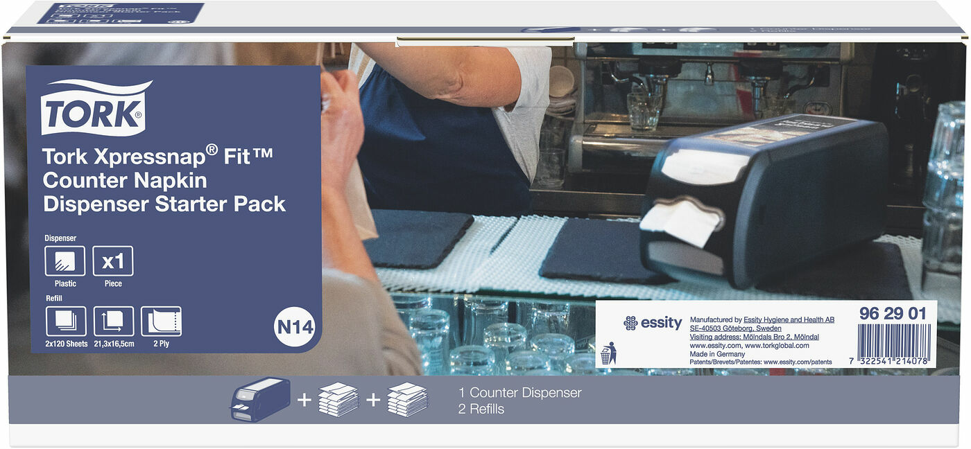 • Praktiskt och bekvämt starterpack som innehåller en Tork Xpressnap Fit® Bordsdispenser och två buntar med Tork Xpressnap Fit® Vit Dispenserservett (2-lags)